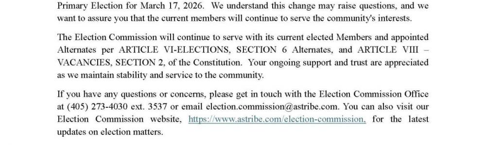 If you have any questions or concerns, please get in touch with the Election Commission Office at 405.273.4030 ext. 3537 or email election.commission@astribe.com. You can also visit our Election Commission website, https://www.astribe.com/election-commission, for the latest updates on election matters.