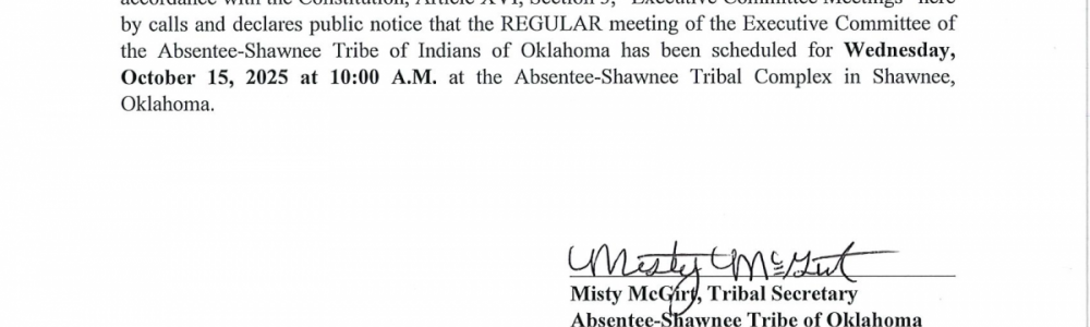 The Executive Committee of the Absentee Shawnee Tribe of Indians of Oklahoma, in accordance with the Constitution, Article XVI, Section 3, “Executive Committee Meetings” here by calls and declares public notice that the REGULAR meeting of the Executive Committee of the Absentee Shawnee Tribe of Indians of Oklahoma has been scheduled for Wednesday October 15, 2025 at 10 AM at the Absentee Shawnee Tribal Complex in Shawnee, Oklahoma.
