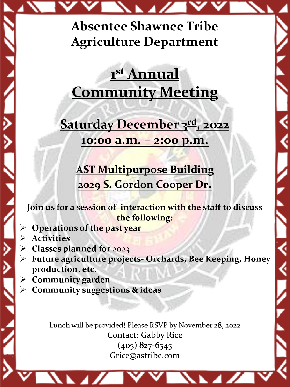 Saturday December 3rd, 2022 10:00 a.m. – 2:00 p.m. AST Multipurpose Building 2029 S. Gordon Cooper Dr., Shawnee, OK