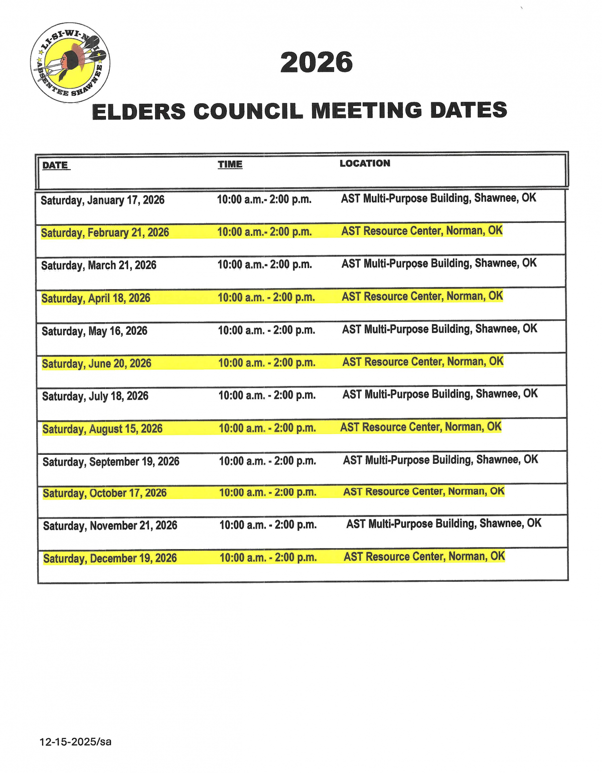 2026 AST Elders Council Meeting Schedule
