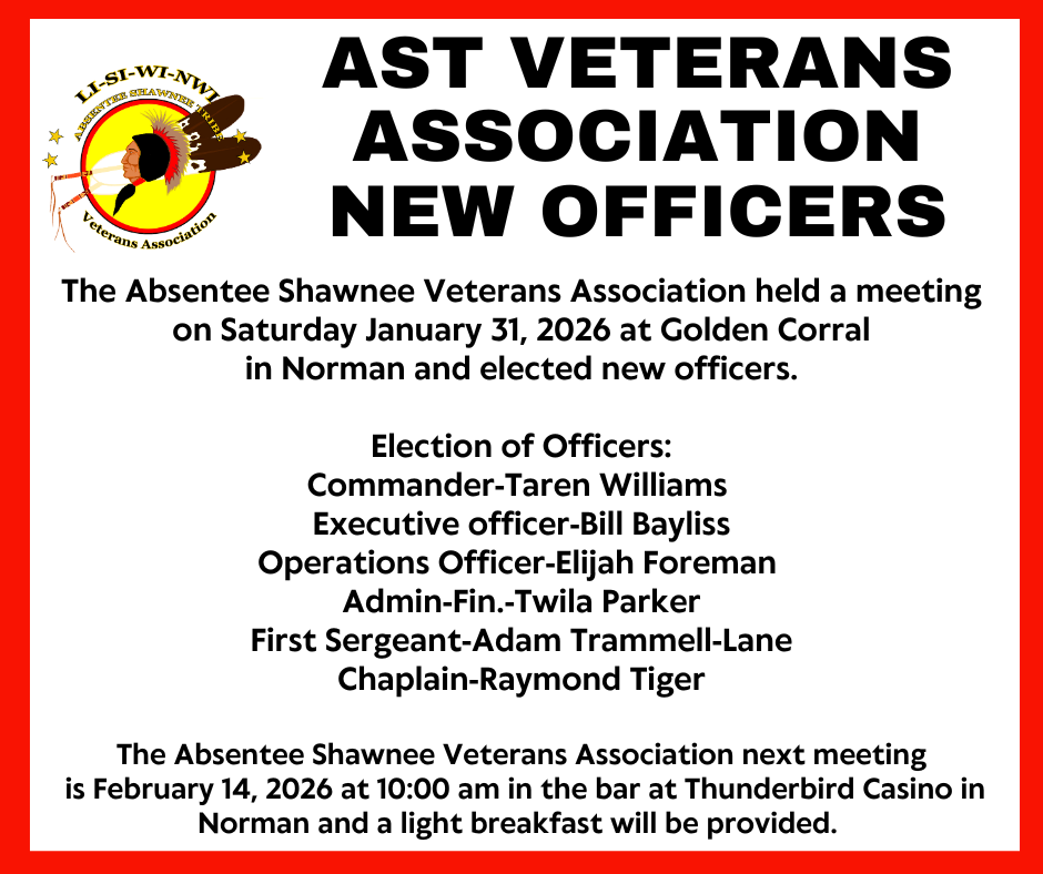 Veterans make sure to attend their next meeting February 14 at 10 am at Thunderbird Casino in Norman!