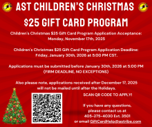Applications for the 2025 Enrolled AST Children's Christmas Gift Cards are now available online. To qualify, your child MUST BE 0-17 years of age on or before 12/31/25 and enrolled AST.