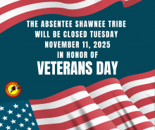 The Absentee Shawnee Tribe is primarily located in the heart of central Oklahoma with approximately 4,723 members who live in all parts of the world as of December 31, 2024. Our tribal government complex is located in Shawnee, Oklahoma. Our logo features Tecumseh, a Shawnee warrior and visionary leader, who worked to unite tribes in a common homeland where Indians could live under their own laws and leaders. He died in October 1813, in battle near the area of present day Thamesville, in Toronto, Canada. The LI-SI-WI-NWI in our logo means “Among the Shawnee”