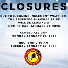 The Executive Committee of the Absentee-Shawnee Tribe of Indians of Oklahoma, in accordance with the Constitution, Article XVI, Section 4, "Executive Committee Meetings" here by calls and declares public notice that the SPECIAL meeting of the Executive Committee of the Absentee-Shawnee Tribe of Indians of Oklahoma on Friday, January 23, 2026 at 10:00 A.M has been rescheduled due to possible incoming inclement weather. The SPECIAL meeting has been rescheduled to Friday, January 30, 2026 at 10:00 A.M at the Absentee-Shawnee Tribal Complex in Shawnee, Oklahoma.