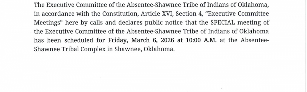 The Executive Committee of the Absentee-Shawnee Tribe of Indians of Oklahoma, in accordance with the Constitution, Article XVI, Section 4, "Executive Committee Meetings" here by calls and declares public notice that the SPECIAL meeting of the Executive Committee of the Absentee-Shawnee Tribe of Indians of Oklahoma on Friday, January 23, 2026 at 10:00 A.M has been rescheduled due to possible incoming inclement weather. The SPECIAL meeting has been rescheduled to Friday, March 6, 2026 at 10:00 A.M at the Absentee-Shawnee Tribal Complex in Shawnee, Oklahoma.