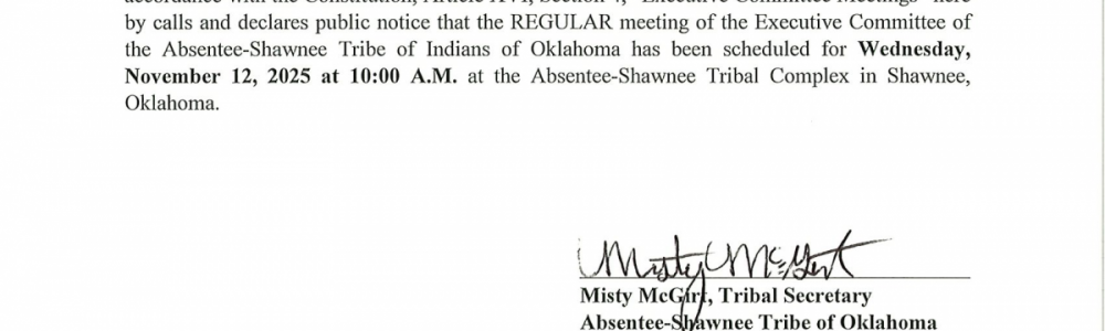 The Executive Committee of the Absentee Shawnee Tribe of Indians of Oklahoma, in accordance with the Constitution, Article XVI, Section 3, “Executive Committee Meetings” here by calls and declares public notice that the REGULAR meeting of the Executive Committee of the Absentee Shawnee Tribe of Indians of Oklahoma has been scheduled for Wednesday November 12, 2025 at 10 AM at the Absentee Shawnee Tribal Complex in Shawnee, Oklahoma.