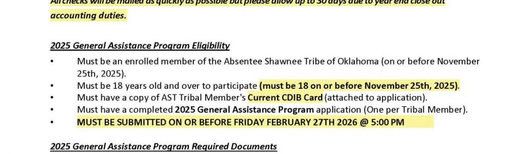 MUST be an enrolled member of the Absentee Shawnee Tribe of Oklahoma (on or before November 25th, 2025).