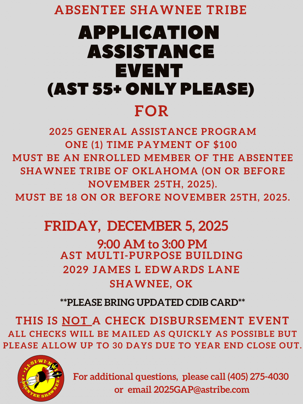 We will be having an application assistance event for the 2025 General Assistance Program (1 time payment of $100).