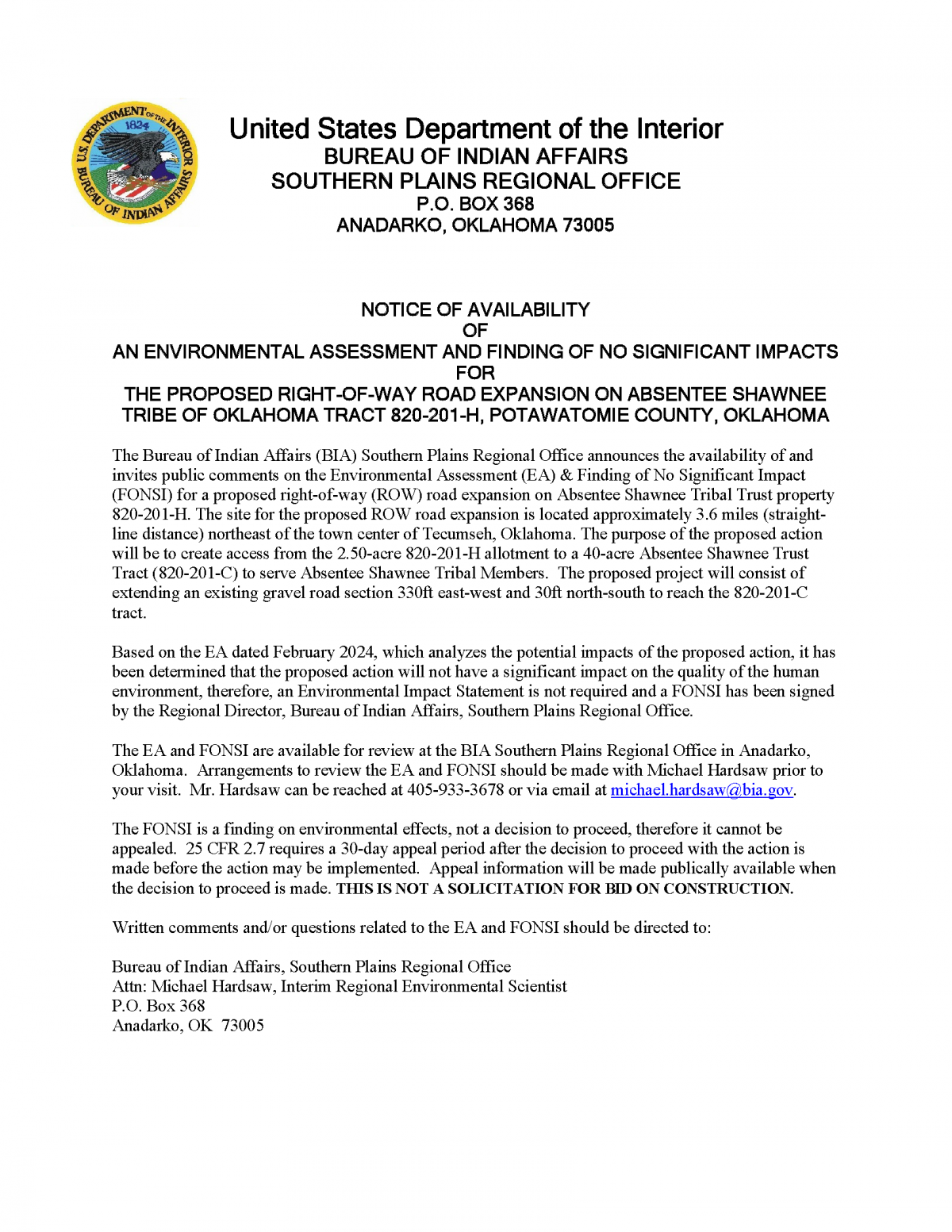 (FONSI) for a proposed right-of-way (ROW) road expansion on Absentee Shawnee Tribal Trust property 820-201-H. The site for the proposed ROW road expansion is located approximately 3.6 miles (straight-line distance) northeast of the town center of Tecumseh, Oklahoma. The purpose of the proposed action will be to create access from the 2.50-acre 820-201-H allotment to a 40-acre Absentee Shawnee Trust Tract (820-201-C) to serve Absentee Shawnee Tribal Members. The proposed project will consist of extending an existing gravel road section 330ft east-west and 30ft north-south to reach the 820-201-C tract.