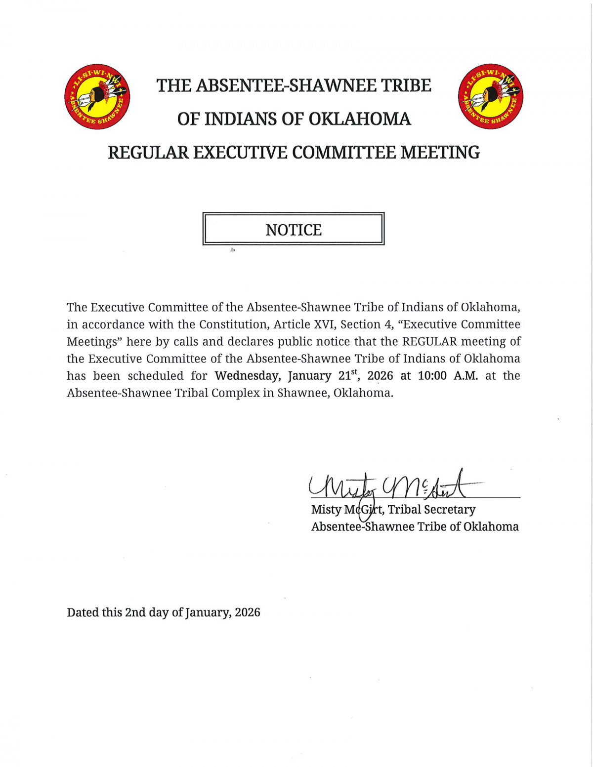 The Executive Committee of the Absentee Shawnee Tribe of Indians of Oklahoma, in accordance with the Constitution, Article XVI, Section 4, “Executive Committee Meetings” here by calls and declares public notice that the REGULAR meeting of the Executive Committee of the Absentee Shawnee Tribe of Indians of Oklahoma has been scheduled for Wednesday January 21, 2026 at 10 AM at the Absentee Shawnee Tribal Complex in Shawnee, Oklahoma.