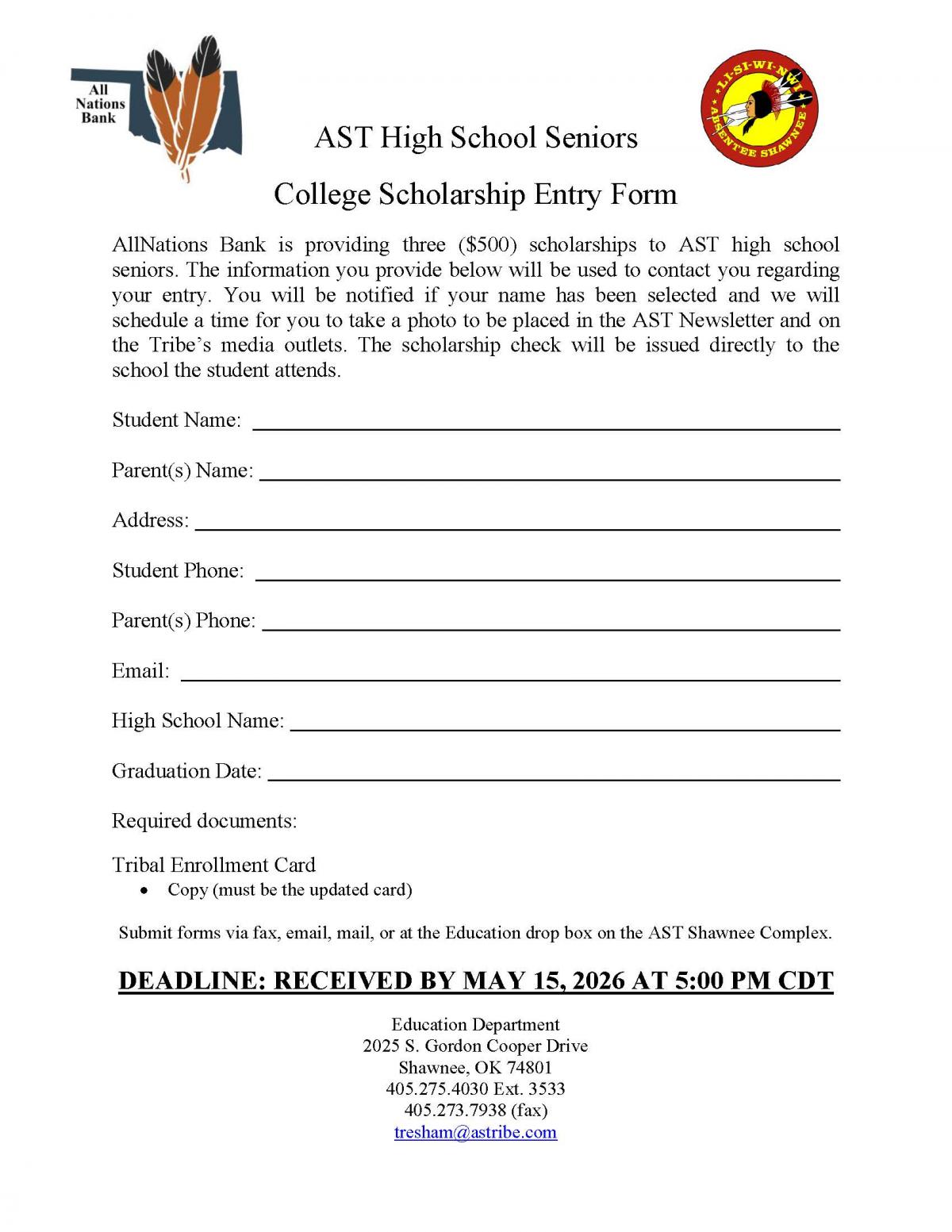 AllNations Bank is providing three (3) $500 scholarships to AST high school seniors. The information you provide below will be used to contact you regarding your entry. You will be notified if your name has been selected and we will schedule a time for you to take a photo to be placed in the AST Newsletter and on the Tribe’s media outlets. The scholarship check will be issued directly to the school the student attends.