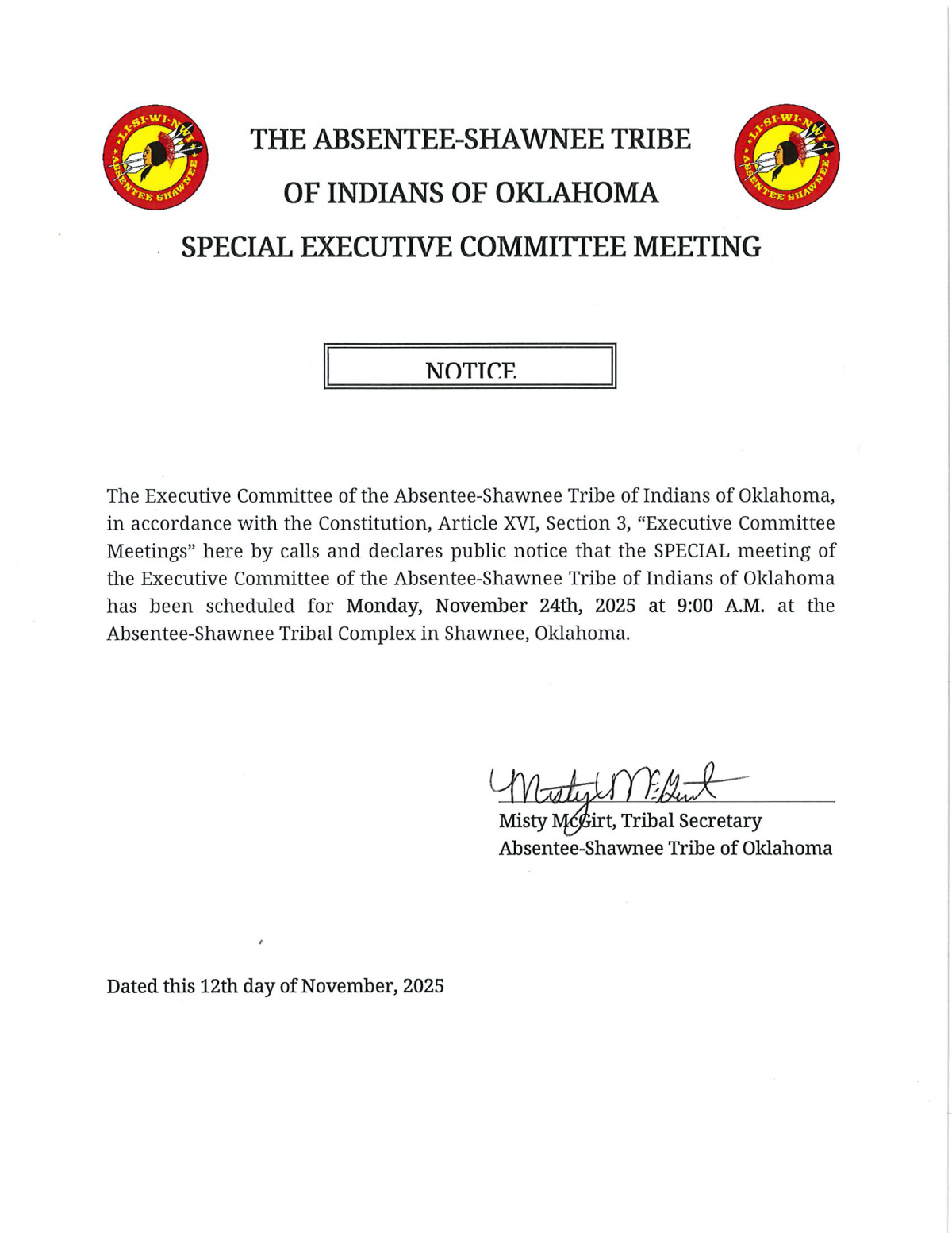 The Executive Committee of the Absentee Shawnee Tribe of Indians of Oklahoma, in accordance with the Constitution, Article XVI, Section 4, "Executive Committee Meetings" hereby calls and declares public notice that the SPECIAL meeting of the Executive Committee of the Absentee Shawnee Tribe of Indians of Oklahoma has been scheduled for Monday November 24 2025 at 9 AM at the Absentee Shawnee Tribal Complex in Shawnee, Oklahoma.