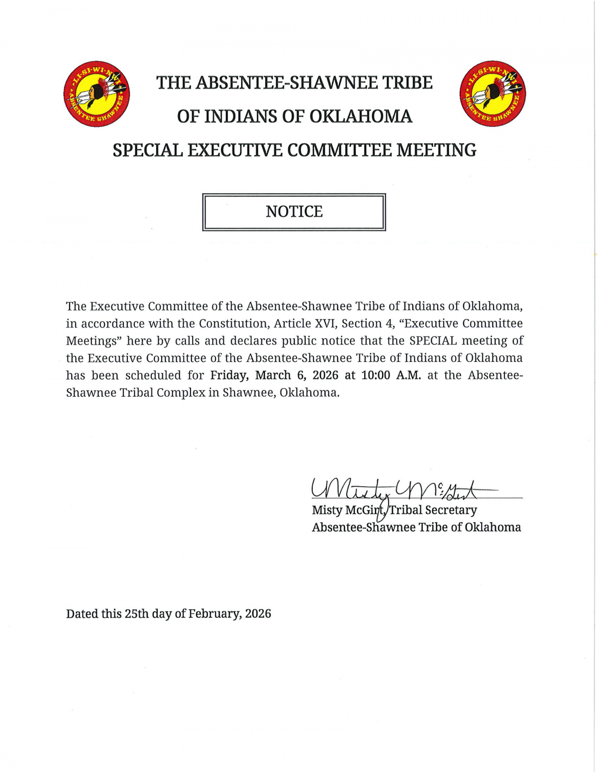 The Executive Committee of the Absentee-Shawnee Tribe of Indians of Oklahoma, in accordance with the Constitution, Article XVI, Section 4, "Executive Committee Meetings" here by calls and declares public notice that the SPECIAL meeting of the Executive Committee of the Absentee-Shawnee Tribe of Indians of Oklahoma on Friday, January 23, 2026 at 10:00 A.M has been rescheduled due to possible incoming inclement weather. The SPECIAL meeting has been rescheduled to Friday, March 6, 2026 at 10:00 A.M at the Absentee-Shawnee Tribal Complex in Shawnee, Oklahoma.